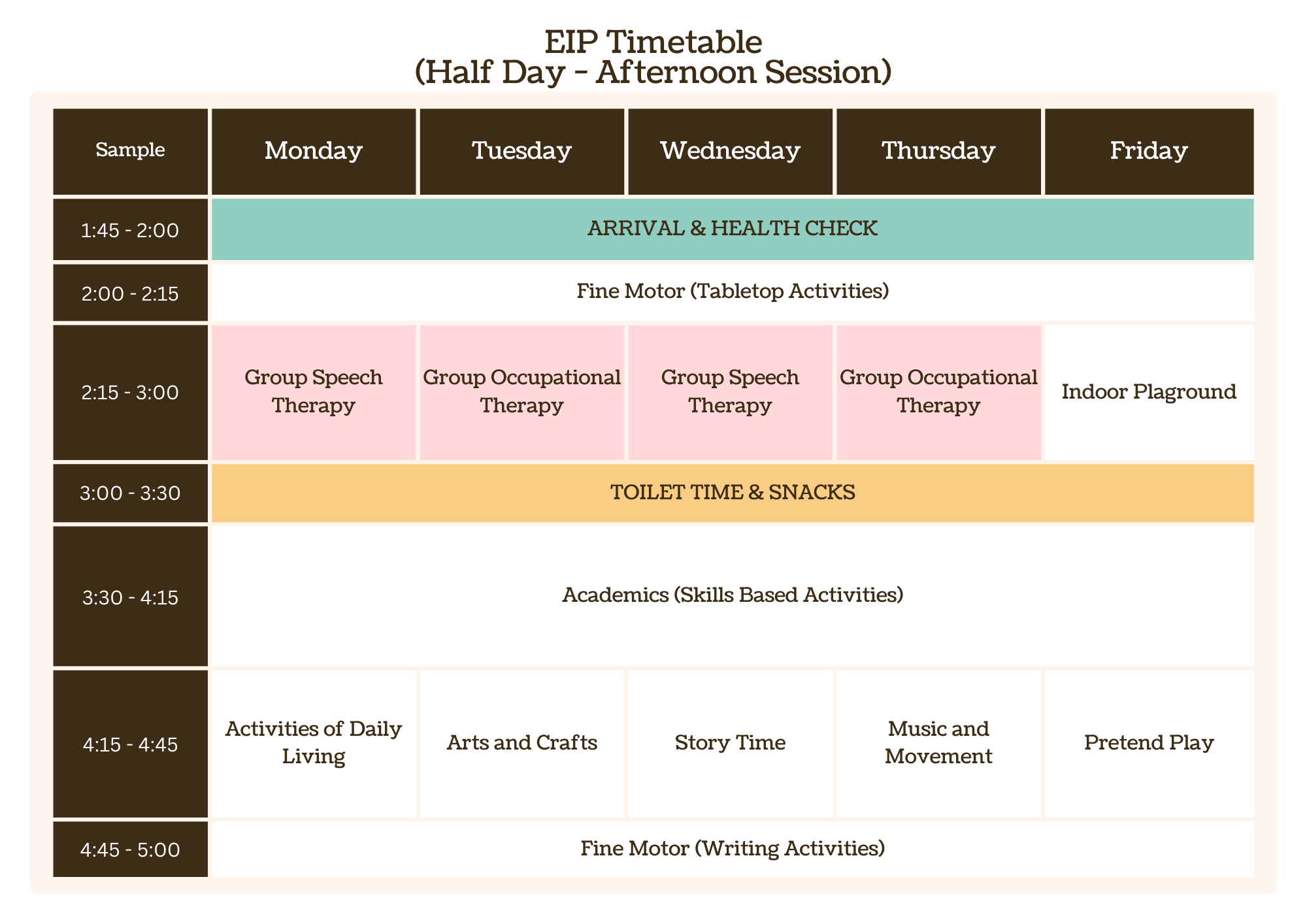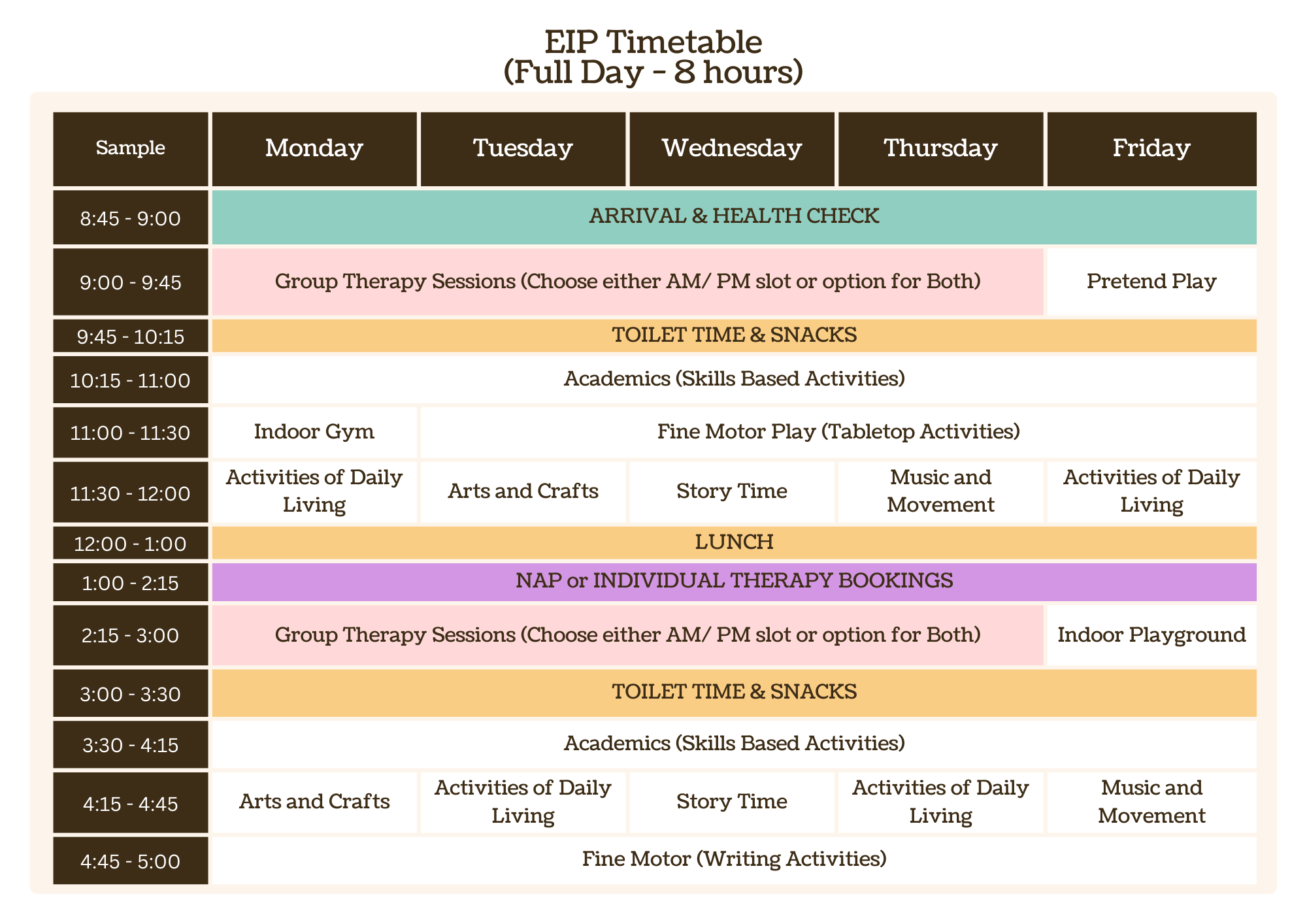 | 11:15 am - 12:00 pm | Fine Motor Play | Arts and Crafts | Story Time | Music | Fine Motor Play |