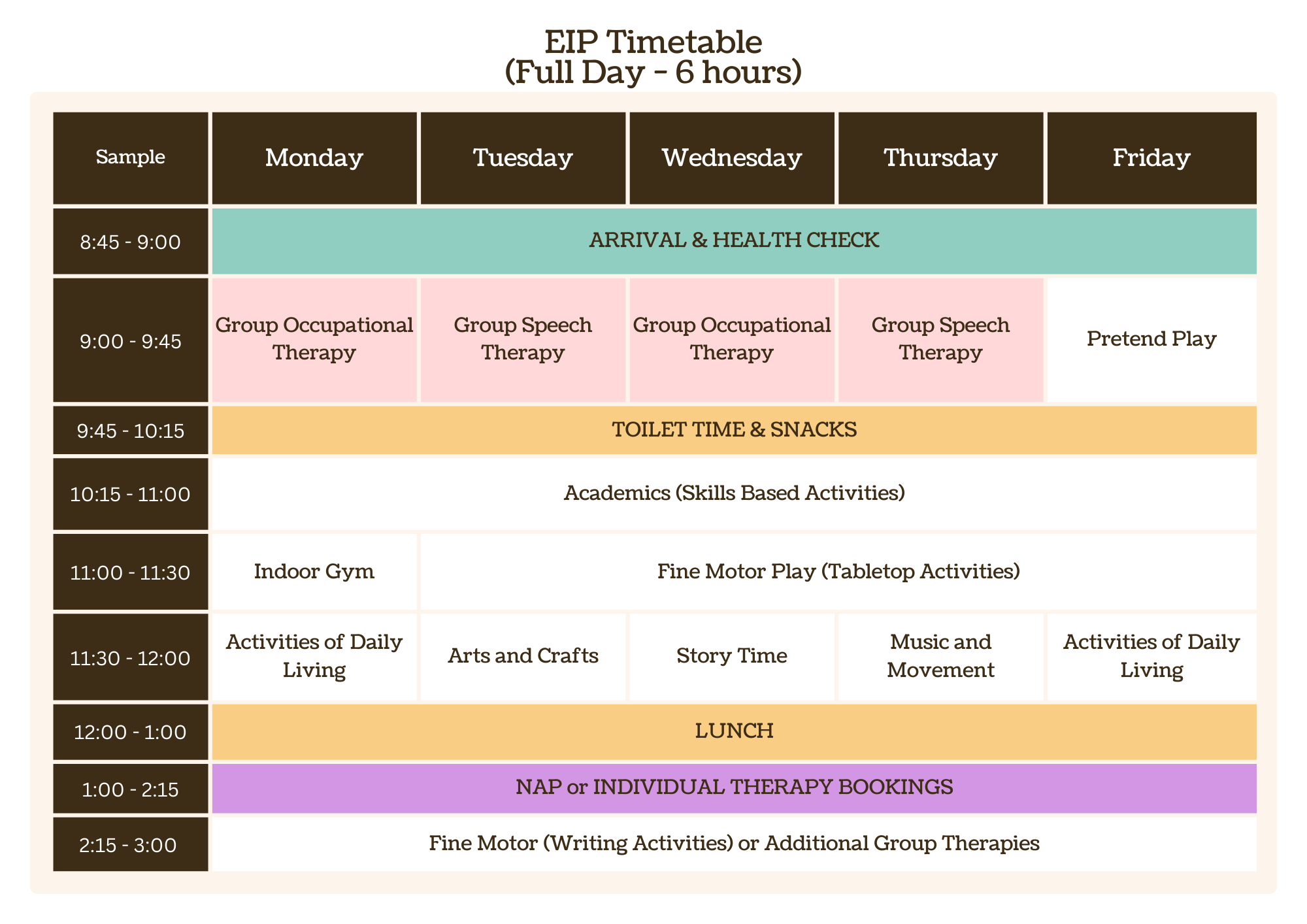 | 10:30 am - 11:15 am | Skill-Based Literacy | Skill-Based Literacy | Fine Motor Play | Skill-Based Numeracy | Skill-Based Numeracy |